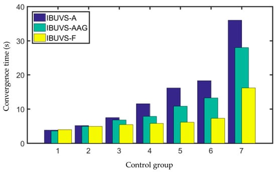 To fully verify the fast convergence of the proposed IBUVS controller (hereinafter referred to as IBUVS-F) near the equilibrium point, the IBUVS asymptotically stabilized controller (hereinafter referred to as IBUVS-A) proposed in the literature [] was selected as a comparison scheme in this experiment. In addition, an adaptive gain function () is presented in the open source visual servo platform ViSP whose adaptive gain can be used to improve IBUVS-A, and another comparison scheme is constructed, abbreviated as IBUVS-AAG. To quantitatively evaluate the differences in convergence time of the above three schemes, it is stipulated in this experiment that when the average modulus of error of four image feature points is less than 10 pixels, the system can be convergent, and the convergence time is taken as the quantitative index.