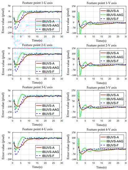 Considering the difference in the gain coefficient of different schemes, to make IBUVS-F comparable with IBUVS-A and IBUVS-AAG, gains with similar control torque output ranges were combined into one comparison group. Specifically, 7 groups of image error term gain coefficients of IBUVS-A, IBUVS-AAG, and IBUVS-F controllers were taken for comparison, as shown in Table 4.