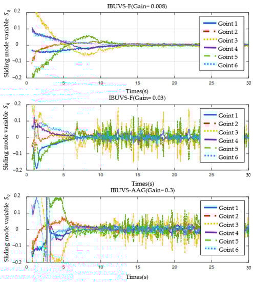 Figure 17 shows the joint sliding mode variable responses of IBUVS-F at 0.008 and 0.03 gain coefficients and of the IBUVS-AAG scheme at 0.3. The joint sliding mode variable gradually approaches zero with the convergence of image errors. It is worth noting that there is a certain degree of high-frequency joint angular velocity response in the sliding mode space of the IBUVS-F joint after system convergence. This is caused by the large control output of the IBUVS-F scheme near the equilibrium point. Compared with the IBUVS-AGG scheme, which also has a convergence time of about 7 s, it is not difficult to see that the high-frequency response level of the angular velocity of the IBUVS-AGG scheme is similar to that of the IBUVS-F scheme. Although the rapid convergence of IBUVS-F near the equilibrium point requires a certain amount of joint space noise, it still has advantages over other schemes. The above analysis proves the effectiveness and superiority of the proposed IBUVS-F scheme.