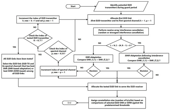 A discrete-time D2D link adaptation scheme is being considered. Guard time is periodically allocated during each data-burst transmission period. It is utilized by the D2D receiver to perform many operations, which include channel quality estimation, co-channel interference cancelation, comparisons of the predicated combined SNRs or SINRs against predetermined thresholds, and allocation of D2D resources. This sequence of operations allows the D2D receiver to choose the suitable D2D transmitter along with its associated spectral channel that can meet the desired performance target via a selection of a suitable constellation size for transmission. When allocation of resources is properly achieved, the D2D receiver informs its D2D transmitter accordingly via a dedicated feedback channel.