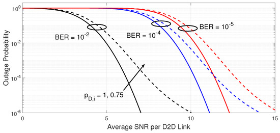 When the D2D receiver antenna array can eliminate the effect of co-channel interference sources, the D2D link is to be performed based on predicted SNRs, as explained in Section 3.4. Note that the predetermined SINR thresholds become SNR thresholds to maintain the expected performance on the D2D receiver. This scenario can occur with a probability in (12). For various digital and coherent modulation schemes of an constellation size, the conditional BER can be expressed as