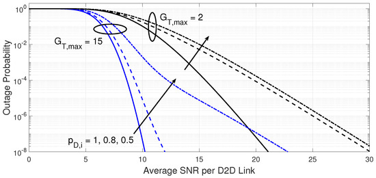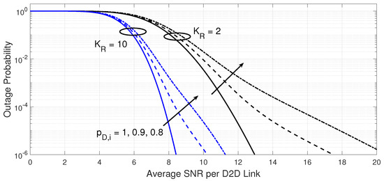 This process continues until the D2D receiver is able to allocate the desired D2D transmitter and its spectral channel. A service outage happens when the D2D receiver fails to allocate D2D resources that can boost the combined SINR above . This event takes place when