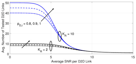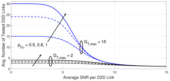 The adaptation approach is adjusted to maximize the potential D2D transmitter’s power efficiency at the expense of limited utilization of spectral channels. Therefore, the selection of the suitable D2D transmitter can be adaptively changed according to the performance demands of the D2D receiver. This process is directly affected by the channel quality of the desired D2D link, as well as the co-channel interference sources that may be assigned the same spectral channel. The process can be operated based on the knowledge of the quality of the desired signal quality alone [44], the aggregate residual interference power alone, or the combined SINRs on potential D2D links. This paper addresses an approach that takes advantage of both the combined SNR and SINRs at the D2D receiver under random numbers of potential D2D transmitters and co-channel interference sources.
