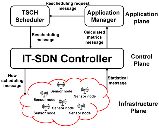 The main contribution of this work is the application-aware (AA) scheduling approach, which modifies the current scheduling approach in real time to ensure the application’s QoS requirements. Figure 1 shows the adopted system architecture, which consists of three planes: (i) the infrastructure plane, (ii) the control plane, and (iii) the application plane. The control plane contains the IT-SDN controller, which periodically receives the traffic data from the infrastructure plane, calculates the delivery rate and delay metrics, sends them to the application plane, and disseminates the new schedule to the network nodes. Two modules were added to the application plane: (1) the application manager module, which periodically receives the calculated metrics, checks if the application’s QoS requirements are met, and asks the TSCH scheduler to assign adequate scheduling, and (2) the TSCH scheduler module, which calculates the new scheduling and sends it to the controller.