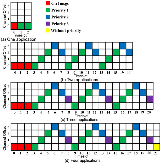 Since control and data traffic isolation and the search feature [16] improved the network performance, we adopt these concepts in our proposed approach. Moreover, to speed up the network convergence, the control messages are transmitted in all the timeslots during the convergence period. After this period, the data messages start to be transmitted using Sch 0 scheduling, as Figure 2 shows. The first timeslot(s) are always reserved for the control messages. The slotframe size is selected to accommodate the additional applications and to prioritize the applications with harder requirements. In Figure 2b, where two applications are considered, nine timeslots (56.25% of the slotframe size) are assigned to Application 1, compared with six timeslots (37.5% of the slotframe size) assigned to Application 2.
