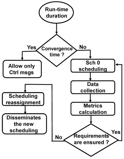 Since the considered applications send data messages at different DTR values, the node does not send its statistical message about an application if the number of transmitted messages for this application is zero. To explain this, suppose that the DTR value of Application 2 is 10 min. This means that the first data message for this application is transmitted after 10 min from the start of the run-time. During these 10 min, the nodes do not send statistical messages for Application 2 to the controller. The calculated metrics are sent to the application manager module to verify if the application’s QoS requirements are satisfied. If so, Sch 0 continues to be the adopted scheduling. Otherwise, the TSCH scheduler module assigns a new scheduling and sends it to the controller, which in turn, disseminates it to the network nodes. Figure 3 shows the sequence of all the system operations.