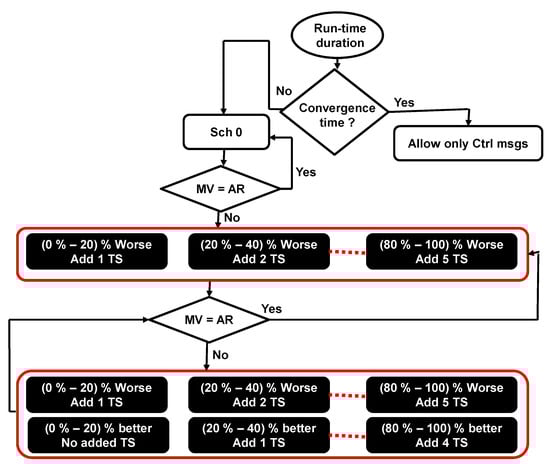 As a general rule, for N greater than or equal to 20, if the calculated metric is from N% to (N + 20)% better than the application’s requirement, X timeslots are removed from the end of the slotframe. This leads to saying that if the calculated metric is from (N + 20)% to (N + 40)% better than the application’s requirement, (X + 1) timeslots are removed from the end of the slotframe. Figure 4 shows the scheduling calculation procedure considering that MV is the metric value, AR is the application’s requirement value, and TS represents the timeslot. Assigning multiple timeslots per application at the same time (if needed) could help to reduce the time required to ensure the application’s requirements. Removing multiple timeslots (if needed), on the other hand, could help to save energy and increase the network lifetime.
