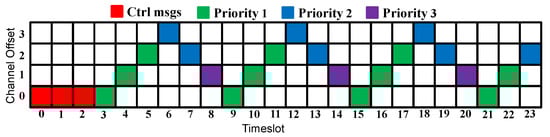 Several issues about SDWSN on top of TSCH were investigated, including interference and multipath fading [15], traffic competition over the wireless medium [9,14,16], mobility management [17], and ensuring the application’s requirements [18,19]. Each of these works concentrated on some scheduling approach to handle these issues. However, most of them did not support network scalability since they used dedicated timeslots in the scheduling approach. Orozco-Santos et al. [20] addressed the scalability issue over SDWSNs. Nonetheless, the proposed approach was based on the creation of virtual sinks, which necessitates the addition of several radio interfaces. The literature review then revealed that there is still a gap in providing the required QoS level for scalable SDWSNs without requiring any extra radio interfaces.