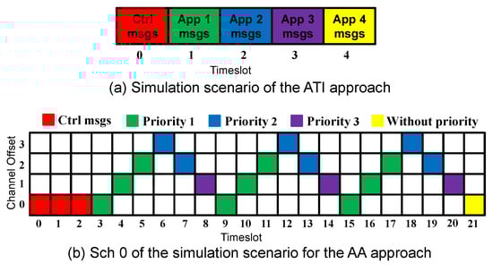 To compare the ATI approach, which assigns a single timeslot per application, with the AA approach, we consider the case of 4 applications running simultaneously. Figure 6 depicts the simulation scenario for each approach.