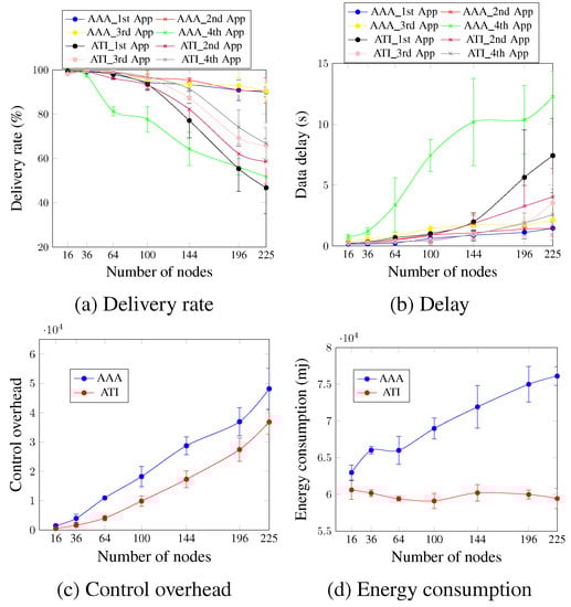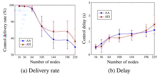 Concerning the control plane, Figure 8 depicts the control delivery rate and control delay for the case of four applications running simultaneously. Figure 8a,b show that, in general, both approaches present similar values for the increasing number of nodes, and the ATI approach performs slightly better than the AA approach. For a network size of 144 nodes, the ATI approach increased the control delivery rate by 4.65% and decreased the control delay by 7.45% in comparison with the AA approach. This could be justified by the number of exchanged control messages after the network convergence for both approaches. This number is higher for the AA approach, which increases the probability of packet drop due to the buffer fullness and increases the time that the message waits to be processed.