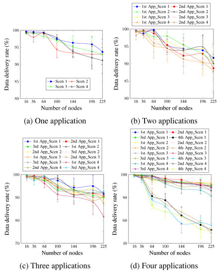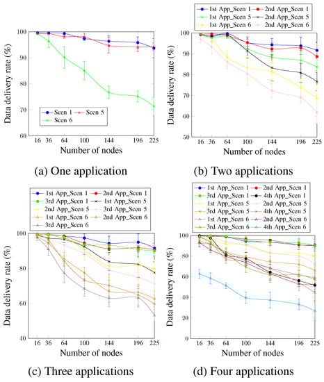Figure 15 depicts the data delivery rate for up to four applications running simultaneously. For a single application (Figure 15a), it is clear that the high DTR values significantly reduced the data delivery rate. Thus, Scen 6, which has the highest DTR value, presented the worst values. This occurs since the higher data traffic rate leads to more congestion and increases the probability of packet drop due to the buffer fullness. For Scen 1 and Scen 5, the AA approach ensured the data-delivery rate requirement for network sizes up to 225 nodes, compared with network sizes up to only 36 nodes in the case of Scen 6. To justify these findings, it should be noted that for a network size of 100 nodes, for instance, 98 data messages are sent per minute in the case of Scen 1 and Scen 5, compared with 5880 data messages per minute for Scen 6. For two applications, Figure 15b shows that Scen 1, with the lowest DTR value, continues to present better values than Scen 5 and Scen 6 for all cases. For the first and second applications, the satisfied network sizes are reduced from 196 nodes for Scen 1 to 100 nodes and 36 nodes for Scen 5 and Scen 6, respectively. Concerning the three applications, Figure 15c depicts that for the third application, which has a delivery rate requirement of 90%, the sizes of the satisfied networks increased from 36 nodes in the case of Scen 6 to 64 nodes and 225 nodes for Scen 5 and Scen 1, respectively. For four running applications, as Figure 15d shows, Scen 6, the scenario with the highest DTR value, continues to present the worst data-delivery rate values compared with Scen 1 and Scen 5. This is also applied to the fourth application, which has no priority. For a network size of 225 nodes and the fourth application, the data-delivery rate was 51.72% for Scen 1, compared with 44.53% and 26.81% for Scen 5 and Scen 6, respectively.