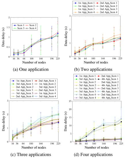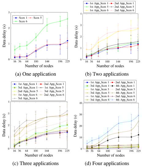 For three and four running applications (Figure 16c,d), the DTR value is directly proportional to the obtained delay values for all cases. This means that the scenarios with higher DTR values presented higher delay values. Concerning the fourth application, it presents the worst delay values since it is accommodated using a single timeslot and has no priority. For a network size of 196 nodes, the obtained delay values were 10.37 s, 16.37 s, and 24.37 s for Scen 1, Scen 5, and Scen 6, respectively. These values confirm, again, the high effect of the selected DTR value on the delay requirement.