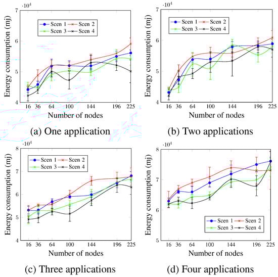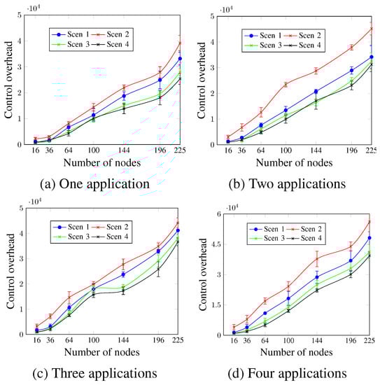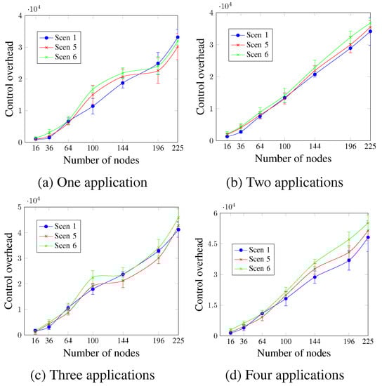 Figure 17 shows that the control overhead increases with the number of nodes, regardless of the DTR value and the number of applications. For two and four applications, as Figure 17b,d show, all scenarios presented similar values for the network sizes up to 100 nodes. For larger network sizes, the control overhead is directly proportional to the DTR value. This means that Scen 6 with the highest DTR had the highest control overhead values, whereas Scen 1 had the lowest. For a network size of 196 nodes and four running applications, the control overhead values were 36,926.2 messages, 40,301.4 messages, and 47,097.8 messages for Scen 1, Scen 5, and Scen 6, respectively. This occurs since higher DTR requires more exchanged control messages (rescheduling request message, rescheduling message, and new scheduling message), as an attempt to ensure the application’s QoS requirements.