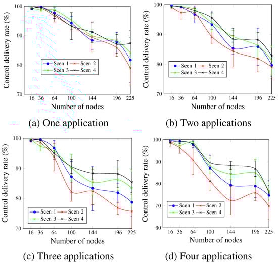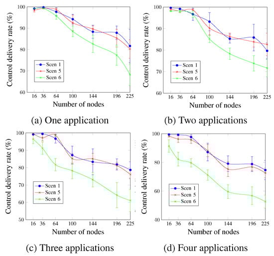 Figure 19 shows that Scen 1 and Scen 5 have roughly similar control delivery rate values. Scen 6, however, presents the worst values for all cases. This confirms that the control delivery rate is inversely proportional to the DTR value. For four applications and a network size of 144 nodes, Figure 19d shows that the obtained values were 59.64% for Scen 6, compared with 79.16% and 75.34% for Scen 1 and Scen 5, respectively. This is due to the additional control traffic in the case of Scen 6, which increases the congestion during the control timeslots after the network convergence.