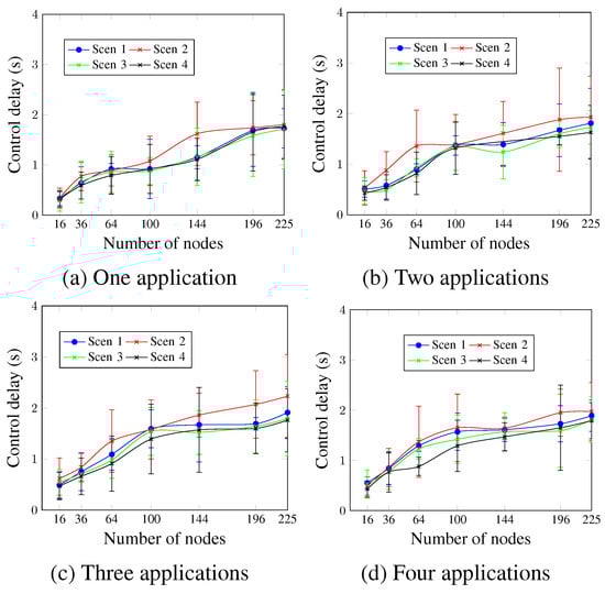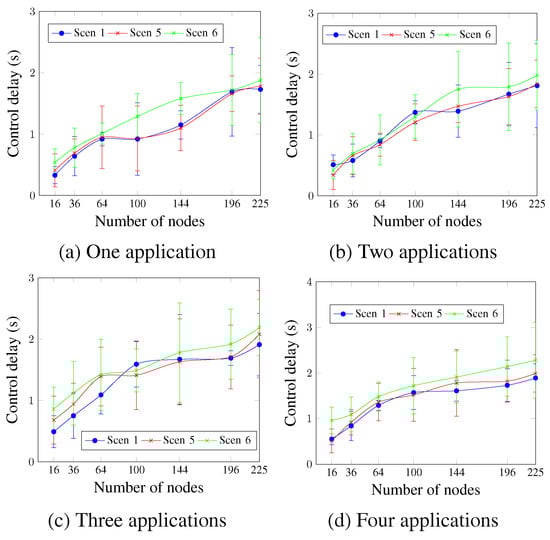 The control delay is shown in Figure 20. Similarly to the control delivery rate, the obtained control delay values show that Scen 6 continues to present the worst values, whereas Scen 1 and Scen 5 present similar values for most cases. For two applications and a network size of 144 nodes, Figure 20b shows that the control delay values were 1.75 s for Scen 6, compared to 1.39 s and 1.47 s for Scen 1 and Scen 5 respectively.