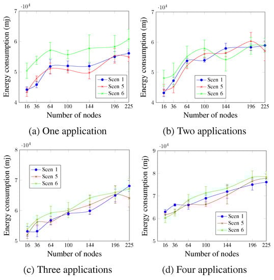 Concerning data delay, Figure 16 depicts that for a single application (Figure 16a), Scen 6 presents the highest delay values since it has the highest DTR value. Scen 1 and Scen 5 present similar values for the different network sizes. This occurs because there is just one application, and the DTR values for both Scen 1 and Scen 5 are hence equal. The delay requirement keeps ensuring network sizes up to 144 nodes for Scen 1 and Scen 5, compared with 64 nodes for Scen 6. For the case of two applications and the first application, as Figure 16b shows, the AA approach ensures the delay requirement for network sizes up to 100 nodes for Scen 1, compared with 144 nodes for the single application case. This could be justified using the second application, which raised the network traffic and prevented ensuring the delay requirement for network sizes larger than 100 nodes. The second application has a delay requirement of 950 ms, and the AA approach ensured the requirement for up to 100 nodes, 64 nodes, and 36 nodes for Scen 1, Scen 5, and Scen 6, respectively.