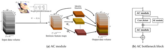 where ϕ i , j is the j-th linear operation used to generate the j-th feature map y i j , and  y i is the i-th intrinsic feature map in Y . Finally, the last ϕ i , s is the identity mapping for preserving the intrinsic feature maps as shown in Figure 2a. In the implementation of linear operations, the group convolution is performed using linear operations. The AC module can obtain n = m × s feature maps Y = [ y 11 , y 12 , , y m s ] . With a set of intrinsic feature maps, the AC module generates a large number of feature maps at a low cost by using a series of parallel linear transformations.