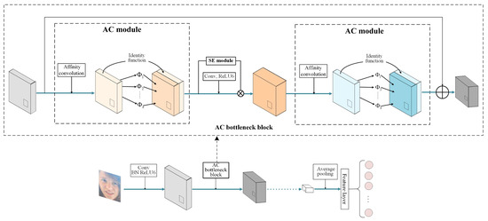 Based on affinity convolution (AC), we propose an efficient neural architecture for FER. The proposed neural architecture is an efficient CNN based on an AC bottleneck block. First, we introduce the AC bottleneck block architecture in Figure 2b. Unlike in a conventional bottleneck block, a squeeze-and-excitation (SE) block [46] is inserted between the AC modules. The squeeze-and-excitation (SE) network, recognized as the winner of the ImageNet large-scale visual recognition competition (ILSVRC) 2017, has shown significant performance improvements for state-of-the-art deep architectures, albeit with a slightly higher computational cost. The SE block [44] is an innovative architectural unit designed to enhance the representational capacity of a network by enabling dynamic channel-wise feature recalibration [46]. Through the proposed AC bottleneck block, the percentage of pointwise convolution calculations in the overall network is reduced. Furthermore, the AC bottleneck block is also capable of performing multiple depthwise convolutions of different scales in order to extract the spatial features of an input feature map, thereby revealing more diverse and abstract information about the input feature map.