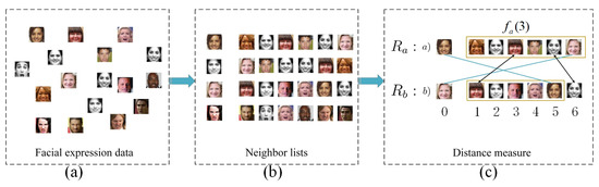 First, we learn the deep features of the facial expression data from the deep feature extractor, as shown in Figure 4a. We measure the distance between two data according to their order in each other’s neighborhoods, i.e., the rank-order distance, as shown in Figure 4b. Second, we compute a series of top-k nearest neighbors in the facial expression data for the labeled expression data, as shown in Figure 4c. Depending on whether the data share nearest neighbors, the distance between data x ( a ) and x ( b ) is computed as follows:
