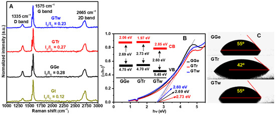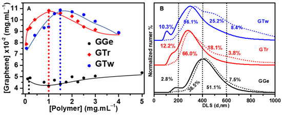 Graphene in aqueous solutions develops a zeta-potential, which refers to the potential and electric double layer formed at the interface and is highly associated with dispersion stability [61]. A high magnitude zeta-potential indicates repulsion between flakes and can imply stable dispersions. For diluted dispersions (0.02 mg·mL−1) at pH 6.4, the zeta-potential for GTr and GTw was found to be −38.5 mV, while for GGe it was −41.5 mV. The greater zeta-potential for GGe can be attributed to the contribution of both steric and static stabilizing mechanisms. The negative zeta-potential indicates that the net surface charge of the graphene flakes is negative, and the zeta-potential values are sufficient to prevent graphene flakes from precipitating, ensuring stable dispersions.