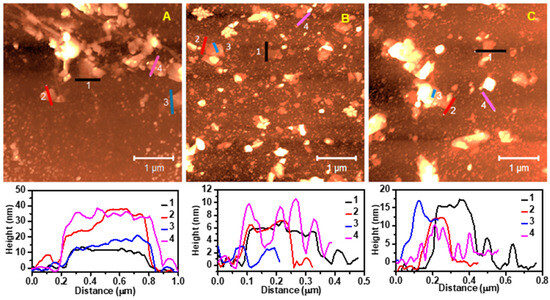 One consistent observation in the AFM images was the presence of a coating of deposited dispersant-like residue on the graphene and mica substrate surfaces. These coatings achieved a height of 10 nm on top of the mica substrate with GTr (Figure 3B, profile 4) and GTw (Figure 3C, profile 4), and a height of 25 nm with GGe (Figure S5). Additionally, the dispersant accumulations on the graphene’s surface reached a height of 2 nm for GTr (Figure 3B, profile 3), 5–10 nm for GTw (Figure 3C, profile 3), and 10–20 nm for GGe (Figure 3A, profile 2). Due to these accumulations on the mica and everywhere around graphene flakes (bottom and top), estimating the number of graphene layers by measuring the thickness of exfoliated graphene nanosheets is challenging.
