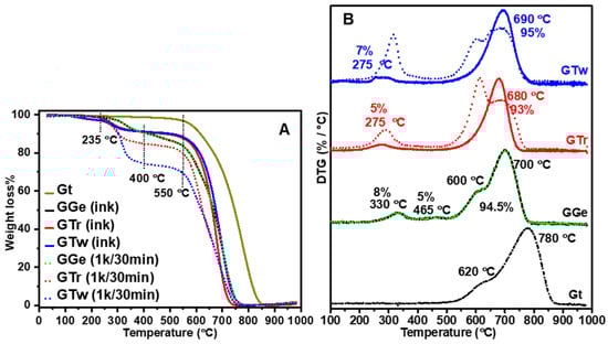 The final inks (shown in Figure 5A,B) underwent a significant decrease in polymer content for triton X-100 and tween-20, with GTr and GTw containing only 5% and 7% polymer, respectively, after the second purification phase (14 k rpm) (as detailed in Table 2). This suggests that the removed triton X-100 and tween-20 dispersants are primarily bound to graphene flakes larger than 400 nm, which were eliminated along with their supernatants during the 14 k rpm centrifugation step. Additionally, the DTG peaks for GTr and GTw improved to semi-symmetrical shapes at 680 °C and 690 °C, respectively, indicating that eliminating larger graphene flakes was associated with the flakes’ thermal degradation. Meanwhile, the DTG curve for GGe showed a slight decrease in gelatin content from 14% to 13% (Figure 5B and Table 2). This implies that the excess gelatin dispersion was successfully removed during the precipitation step of centrifugation at 16 k. The thermogram for GGe maintained a comparable DTG (Figure 5B), suggesting only a minor change in flake size distribution as determined by DLS analysis.