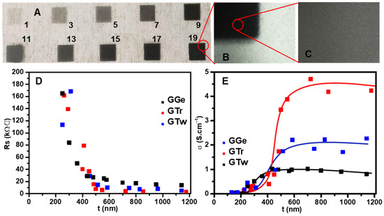 In terms of the electrical behavior, thicker films had lower sheet resistance (Rs), settling at 7.5 kΩ/□, 3.6 kΩ/□, and 2.6 kΩ/□ for GTr films at 500 nm, 800 nm, and 1.15 µm, respectively. For GTw films, Rs settled at 14.4 kΩ/□, 7 kΩ/□, and 5 kΩ/□ for thicknesses of 500 nm, 800 nm, and 1.15 µm, respectively, which is approximately double the Rs recorded for GTr films with the same thicknesses. GGe films had the highest sheet resistance, with 27 kΩ/□, 17 kΩ/□, and 14 kΩ/□ for film thicknesses of 500 nm, 800 nm, and 1.15 µm, respectively. The conductivity (σ) was calculated using the reciprocal of resistivity (ρ) (σ = ρ−1), where ρ was calculated from the multiplication of Rs and t [64]. σ was steady for t > 500 nm (Figure 6E), averaging 4.5 S·cm−1, 2 S·cm−1, and 1 S·cm−1 for GTr, GTw, and GGe, respectively.