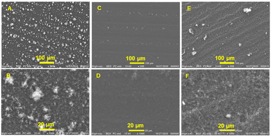 SEM images of graphene films printed on PET substrate from (A,B) GGe, (C,D) GTr, and (E,F) GTw, depicting the morphology of the film’s architecture.
