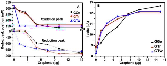 Electrochemical analysis of graphene inks (GGe, GTr, and GTw) deposited on screen-printed carbon electrochemical electrodes. (A) The shift in redox peaks position and (B) Current height in SWV curves.