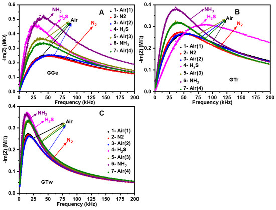 Impedance plot of printed graphene sensors (A) GGe, (B) GTr, and (C) GTw in gas environments (N2, H2S, NH3).