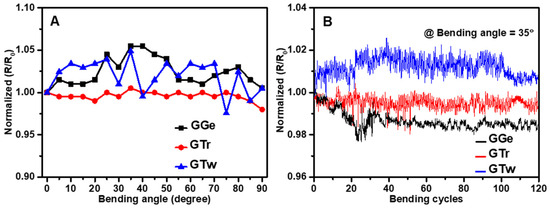 Wearable printed devices with flexibility are highly desirable for their potential use in IoT applications. The critical angle at which the films fail electrically was determined to assess the mechanical flexibility of AJP graphene films. Results showed that GGe and GTw films had a normalized R/R0 ratio increase of 5% against bending angles up to 90° (Figure 11A). On the other hand, GTr exhibited robust mechanical behavior, indicating strong adhesion to the carbon electrodes and correlating with SEM and contact angle observations. Previous studies have validated the mechanical flexibility of carbon electrodes by demonstrating a minimal change in resistance when bent to 90° without losing conductivity [83]. The increase in resistance observed in the present study is due to a change in the orientation and distance between graphene flakes in the printed films. The flexibility of the sensors was then assessed based on their ability to withstand repeated bending at the predetermined critical angle. Results showed no significant change in resistance (2% fluctuation) in any of the printed graphene films after 120 bending cycles at a bending angle of 35° (bending radius 1 cm) (Figure 11B). These findings are consistent with other printed graphene nanocomposites that have demonstrated high durability (>1000 bending cycles) at bending radii ranging from 1 mm to 1 cm [84,85,86]. These results suggest that the formulated graphene films have good mechanical flexibility and could be promising for wearable and flexible IoT devices.