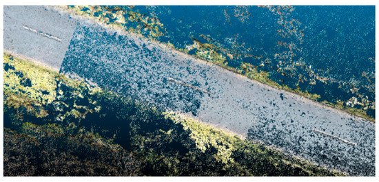 In some studies, the total points appearing in a reconstructed point cloud are used as a proxy to compare the quality of different reconstruction methods. For infrastructure documentation applications, such a broad approach may not encapsulate the true quality of the output, as points appearing in the background or in non-essential areas may contribute little. To determine the extent that captured data appear in the relevant portion of the point cloud, a density conversion rate () metric is proposed as a direct indicator of the yield. As shown in Equation (6), the is the average volume density of the area of interest (AOI), in this case the bridge deck. In this equation, is the total number of points included in the dataset. The indicates the relative value of the overall point cloud with respect to an area of interest (e.g., the bridge deck). Lower values indicate a lower yield percentage with respect to all data collected.