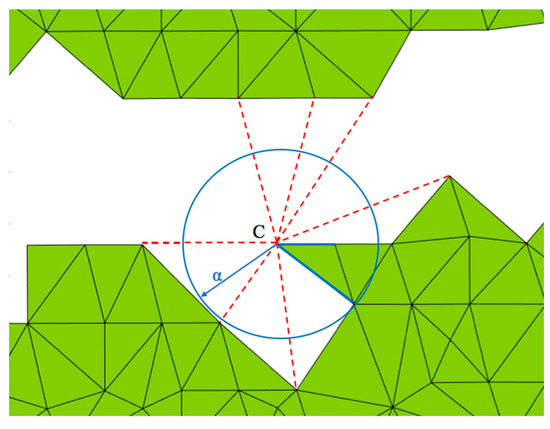 To quantify the completeness of a point cloud, a mesh-based area calculation method is introduced. Since the bridge deck upper surface is nearly a flat plane, to make the calculation more efficient, a 2D mesh is used. The process involves first projecting the data points onto a normal plane. Then, a triangulation mesh is built from the projected data points based on x and y coordinates across an entire plane. Next, the threshold radius α is applied to control the searching radius for the mesh generation. For any point C within the radius α, if a neighbour point exists, a triangular mesh will be generated, as shown in Figure 3. The mesh is then used to calculate the area. Thus, by controlling the threshold α, the areas with and without coverage can be calculated.