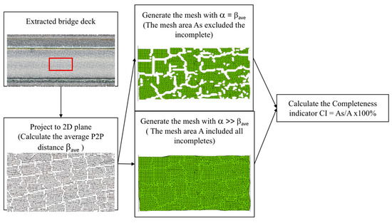 To choose an appropriate α, the average distance of any point to its nearest neighbours must be measured. In this algorithm, points are randomly taken from the original data as querying points and used in a KNN search to find the closest point to each query point. Then, the average Euclidean distance (βave) of all pairs of query points and their closest neighbour are calculated. If the α value is close to or equal to the βave, then the mesh will overlook the incomplete areas and only represent the real data coverage. Instead, if α is set as much larger than the βave, the mesh will connect all points and measure the entirety of the pavement. By comparing these two meshes, the degree of coverage for each dataset can be measured and compared, as shown in Figure 4. The completeness index (CI) is equal to the percentage of the area covered by the points compared to the entirety of the area enveloped inside the boundary, as shown in Equation (4).