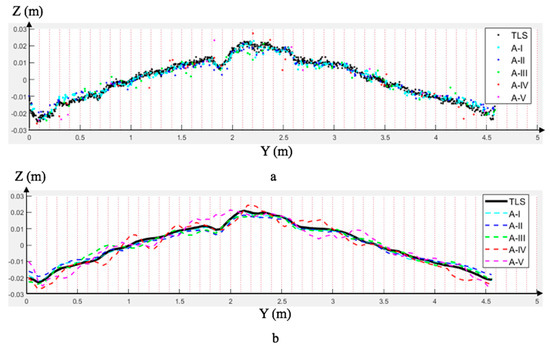 To resolve the problems mentioned above, a cross-section evaluation method for the accuracy assessment is proposed herein. First of all, each SfM dataset and the TLS ground truth point cloud were aligned using the ICP algorithm (Besl and McKay, 1992) [59]. Then, a cross-section (with a thickness of 5 cm in the x-direction) of the bridge deck from each dataset was manually extracted, as shown in Figure 5. After that, those points were projected to the Y–Z plane and separated into multiple intervals in the y-direction (Figure 6a). In each interval, the average Z value was calculated. By linking those points, the local surface was assembled (Figure 6b). Lastly, by measuring the difference between each SfM dataset and the TLS dataset, the Pearson correlation coefficient could be calculated through Equation (5). In that equation, is the covariance between two sets of mean values along the cross-section from different datasets. The terms and are the standard deviations of each set of mean values.