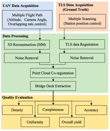 As an alternative to laser scanners, low-cost UAVs equipped with a single digital camera can generate dense and accurate point clouds when coupled with state-of-the-art computer-vision-based methods. Such capabilities have accelerated the adoption of UAV-based data capture for a wide range of infrastructure needs including building modelling (Byrne and Laefer, 2016) [9], dam inspection (Sizeng Zhao et al., 2021) [10], construction site monitoring (Hoegner et al., 2016) [11], and road surface evaluation (Chen and Dou, 2018) [12]. However, there are many factors that directly influence the model’s final accuracy, resolution, and completeness. While these are known to include the camera positioning, number of images collected, overlap extent, and image quality, the interaction between these factors with respect to their impact on the final 3D model quality has yet to be quantified. Additionally, to explore their capability for comprehensive documentation and to devise optimization strategies, a series of reliable and systematic evaluation metrics are required to evaluate the results. To date, these have yet to be established. Therefore, this paper introduces four data quality evaluation metrics for bridge deck or roadway point clouds and investigates the interaction between flight path parameters and the quality of the reconstructed point cloud using those metrics and with respect to a terrestrial laser scanner.