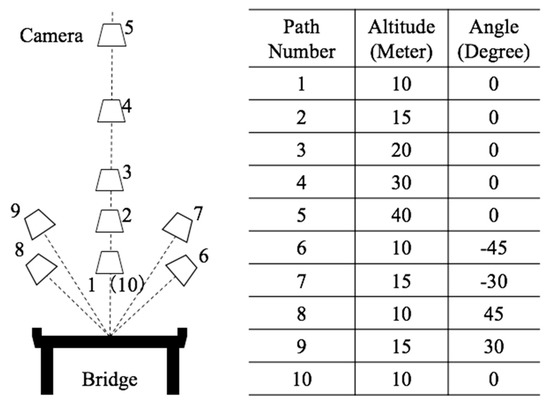 To determine the effect of the oblique angle, two flight paths were undertaken (flight path 9, Figure 8). These were conducted along each side of the bridge, with one oriented at 45° and one at 30° from the bridge deck. In both cases, the offset distance was approximately 15 m from the deck centre and thus captured different vantage points. For flight paths 1–9, the image overlapping rate was above 80%. In addition to those images, path 10 was flown along the previous path, path 1, with an overlapping rate higher than 90%. Table 2, Table 3, Table 4 and Table 5 demonstrate how each of these flight paths were used singly and in combination to create 15 distinct datasets. Dataset Groups A and B used images from single flight paths 1–9 to analyse the effect of altitude and angles. Dataset Group C used multiple flight paths to evaluate the effect of different combination strategies. Dataset Group D used images from flight path 10. Dataset D-I used all images as the input, while D-II and D-III were generated using only the second (D-II) or third (D-III) image in the acquisition sequence. Thus, three different datasets in Group D were created to check the effect of the overlapping rate with respect to image acquisition speed.