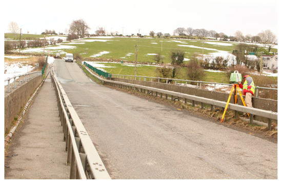 To investigate flight path optimization, an experiment was conducted using the Blessington bridge in County Wicklow, Ireland. The bridge is constructed of reinforced concrete, is approximately 130 m long and 8 m wide, and is typically situated 10 m above the water level (Figure 9).