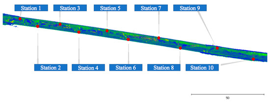 The TLS data to be used for benchmarking were collected with a Leica Scan Station P20 terrestrial laser scanner (Figure 12 and Figure 13). The bridge desk was captured from a total of 10 scan stations (see Figure 14) along the side path of the bridge. The resolution was set as 6.1 mm at 10 m, resulting in a sampling step of 5 mm. That data collection took approximately 3 h by one surveyor including logistics and scanner set up. The scanning only required about 7 min per scan station including data and target capture. Scan co-registration was performed by using Leica’s proprietary software Cyclone (V9.1). The final dataset contained approximately 270 million points. The local geometric accuracy was measured using TLS as the ground truth. TLS data have high resolution and accuracy at close distances via a single scan; multiple long-distance surveys as would be required for global accuracy would have cumulative global errors introduced by the registration process.