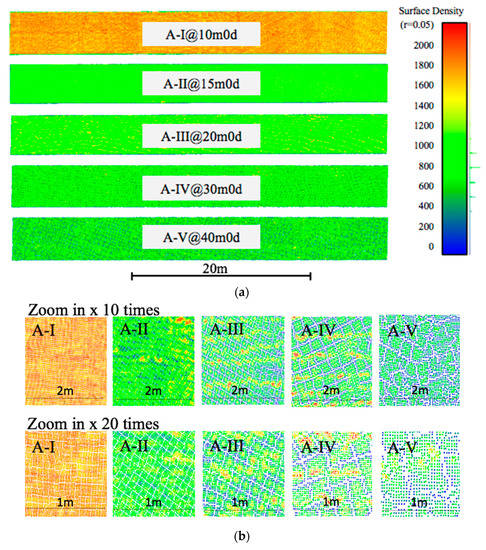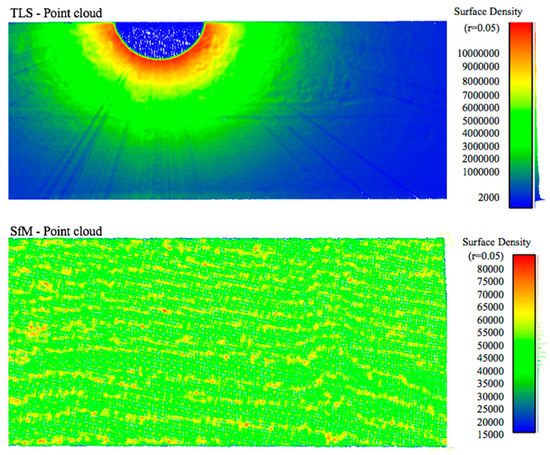 As expected, the TLS dataset had a point density with a radial distribution, with the scanner at its centre producing higher-density point areas closer to the scanner. Lower-density strips are an artefact of cars or pedestrians passing in front of the scanner. Within allowable time constraints, these were minimized by re-performing the scans. In contrast, the SfM point cloud exhibits a largely uniform point distribution across the study area interspersed with waves of slightly lower density strips, as shown in Figure 16. This comparative homogeneity of the data offers a constant data resolution across the entire structure and reduces post-processing difficulties, as previously mentioned. To further understand how the flight path setting interacted with general point density and uniformity, the volume-based density calculation method introduced in Section 3.1 was applied to all 15 datasets (Table 7). The results are shown in Table 8.