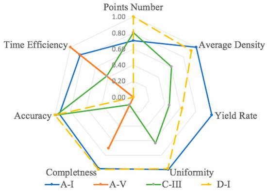 To provide guidance for flight path planning, each category of data analysed in Table 7, Table 8, Table 9, Table 10, Table 11 and Table 12 was normalized by the highest value achieved across the 15 datasets and compiled in Table 13. Those datasets with the best performance in at least one metric were further analysed in a seven-pronged radar map to show a more holistic performance across the various metrics (Figure 19). Unlike previous research using the total point numbers or the average density as a unique standard to evaluate the reconstruction performance, herein seven different metrics are proposed and compared. Both from Table 13 and Figure 19, highly distinctive patterns can be observed.