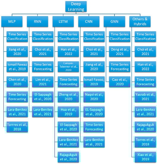 Tree diagram for grouping the popular Deep Learning methods for sensor time series classification and forecasting tasks covered in this survey [30,32,33,34,35,36,37,38,39,40,41,42,43,44,45,46,47,48] (note: if a paper uses two methods separately with similar satisfactory results, the paper will be listed under both groups).