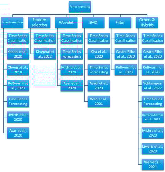 Livieris et al. [10] proposed a preprocessing framework to further improve the efficiency and reliability of the Deep Learning methods. Iterative transformations and augmented Dickey–Fuller test were applied to the time series data for obtaining stationary processed time series data before feeding to the Deep Learning model. The Ljung–Box Q test was employed to check the autocorrelation of the model’s errors. Time series data from energy section, stock market, and cryptocurrency were tested, and the experimental results showed that the proposed preprocessing framework could enhance the efficiency, accuracy, and reliability of the Deep Learning LSTM and CNN-LSTM models considerably. Livieris et al. [91] continued their work on the investigation of the preprocessing framework for Deep Learning models. On top of their previous focus on the transformation of non-stationary time series to stationary by differencing the time series, the raw time series is now subject firstly subject to the exponential smoothing method, which can transform the raw data to a de-noised version. This process is to increase the quality of the time series data and thus improve the prediction capability of the Deep Learning model CNN-LSTM. The experimental results with cryptocurrency, energy, and stock markets confirmed that the preprocessing framework could significantly achieve its objective of further improvement for the Deep Learning models.