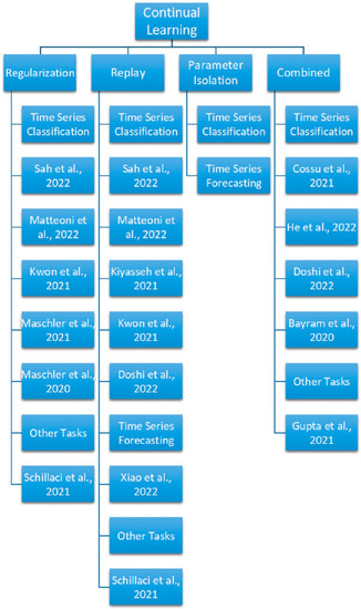 Tree diagram of the taxonomy of the continual learning methods for sensor time series classification and forecasting [93,94,106,107,108,109,110,111,112,113,114,115,116] (note: if a paper uses two methods separately with similar satisfactory results, the paper will be listed under both groups).