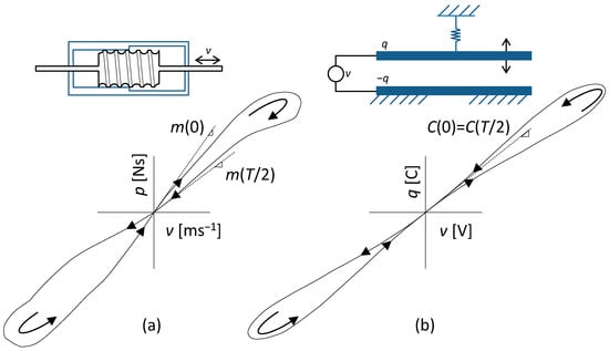 Demonstrations of PHLs of (a) fluid memdashpot (curve taken from [75]), type I; p and v are the moments of inertia and piston velocity; and (b) elastic memcapacitive system (curve taken from [5]), type II; q and v are the electric charge and voltage.