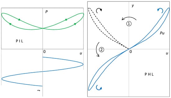 The composition of the two axial symmetries is shown in Figure 3. The right lobe of the PHL is formed from the PIL by the operation y = Pu, where u is the positive half-wave of the excitation. As a result, the orientation of the lobe is preserved. The axial symmetry around the y axis leads to a lobe that must be subjected to a second axial symmetry, this time around the u axis. This second transformation corresponds to the change in the half-wave of excitation from positive to negative. The first transformation reverses the orientation of the lobe; the second brings it back. The PHL is therefore of type II.
