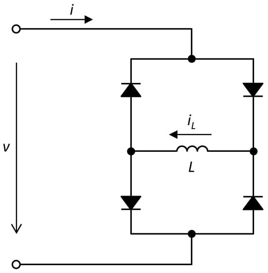 It was published for the first time in [87] that the Graetz rectifier with an LCR-type reactive load behaves like an extended memristor with respect to a voltage source. Figure 4 shows a modification of the original circuit consisting of the use of a purely inductive load [88]. The silicon diodes are of type 1N4148, and the inductance L has a value of 100 mH.