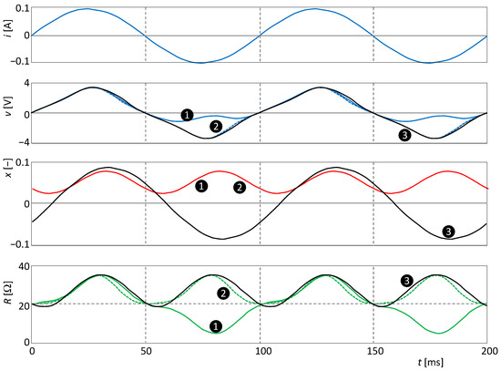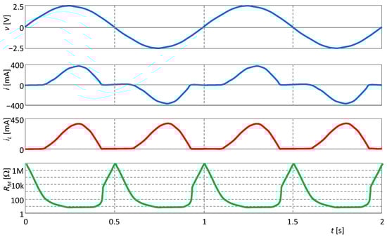 The circuit is excited by a sine-wave voltage with an amplitude of 2.5 V and a frequency of 1 Hz. In Figure 5, the waveforms of the individual quantities are presented, showing that the parameter, which is the memristance RM, oscillates at twice the excitation frequency. Thus, the PHL and PIL must follow Theorems 1 and 2.