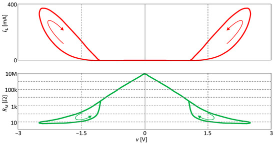 Volatile memelements with type II hysteresis are commonly represented in MEMS in the form of inductors and capacitors dependent on the system geometry or temperature-dependent resistive elements with self-heating. In the vast majority of these cases, the element dynamics, represented by the state Equation (1) or (3), is set in motion by the square of the excitation quantity u(t), be it magnetic or electric field forces or thermal power [2]. For generic elements, this results in the element parameter oscillating at twice the frequency of the excitation quantity, and hence a centrally symmetric hysteresis loop, i.e., a type II loop, is inevitably formed.