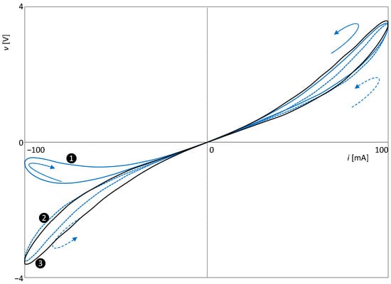 It follows from the dependence between the excitation quantity u and the output quantity y of the extended element (1) that a hysteresis arises due to the state-dependent parameter P(x,u). For bipolar excitation of u and under condition (2), this hysteresis is manifested by the loops in the y − u plane pinched at the origin. Pinched hysteresis loops (PHLs) belong to the fingerprints of extended and generic higher-order elements and thus also to their best known representatives: memristive, memcapacitive, and meminductive systems [66]. If the dynamics of an element respond to a periodic bipolar excitation u via a periodic steady state x whose frequency is an integer multiple of the excitation frequency, then, after the transient decays, the PHL has a steady form that is continuously redrawn during each successive excitation period.